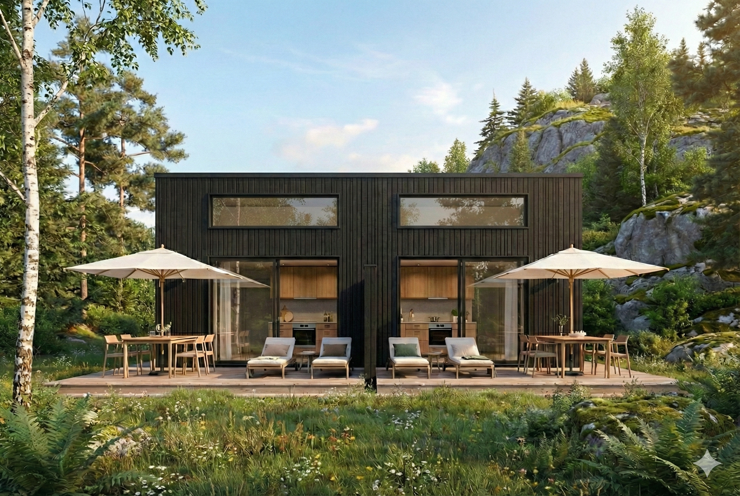 Skapa en miniby dit gäster kan komma för att uppleva natur och miljö i kompakt living. Vi producerar hus i storlekarna 15, 30 samt 45m2 som levereras nyckelfärdiga till din tomt.