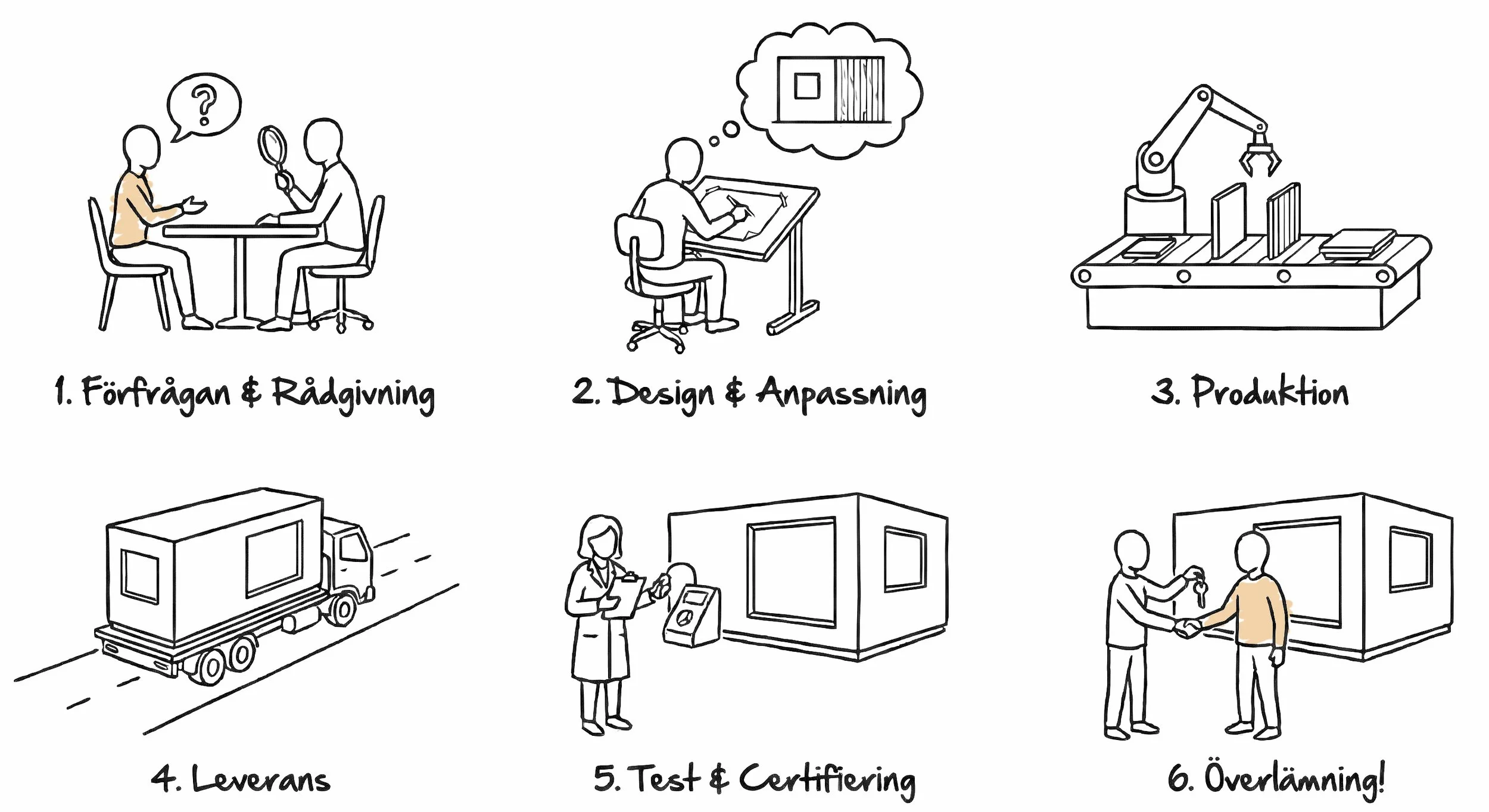 När designen är fastställd övergår projektet till vår noggrant utvalda produktionspartner för Pockethus©, som ansvarar för projektledning och samordning av teknisk projektering, konstruktion och logistik. Avtal tecknas direkt mellan kund och producent.